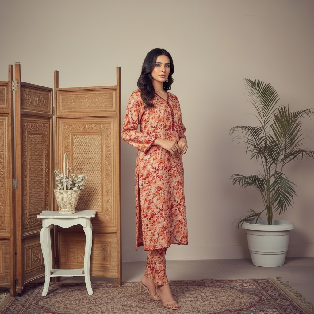 This set features a beautiful all-over floral print in warm, earthy tones with minimalist lace work on the sleeves and daman for a clean, sophisticated look. It’s the perfect balance of comfort and style for your daily wear or casual get-togethers.