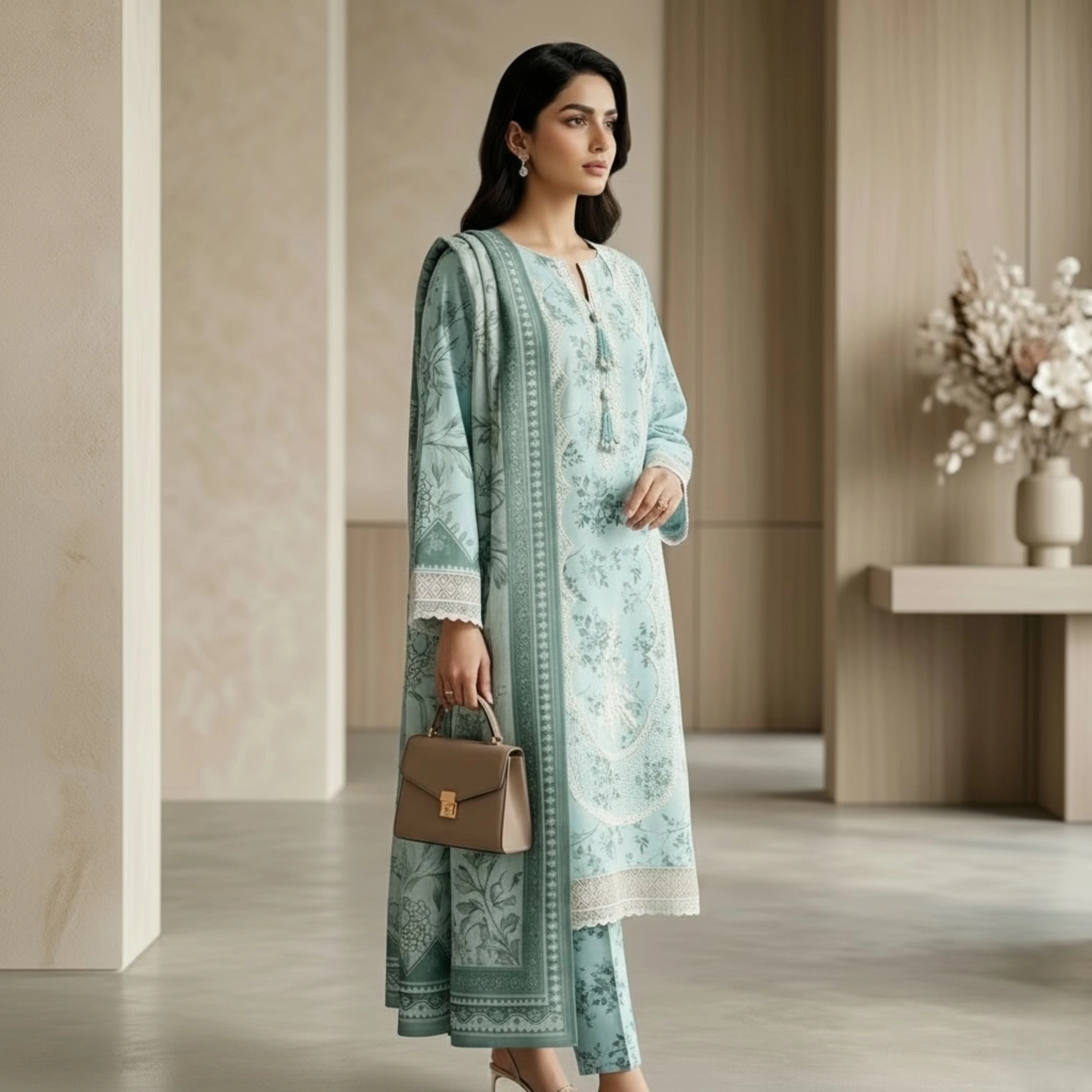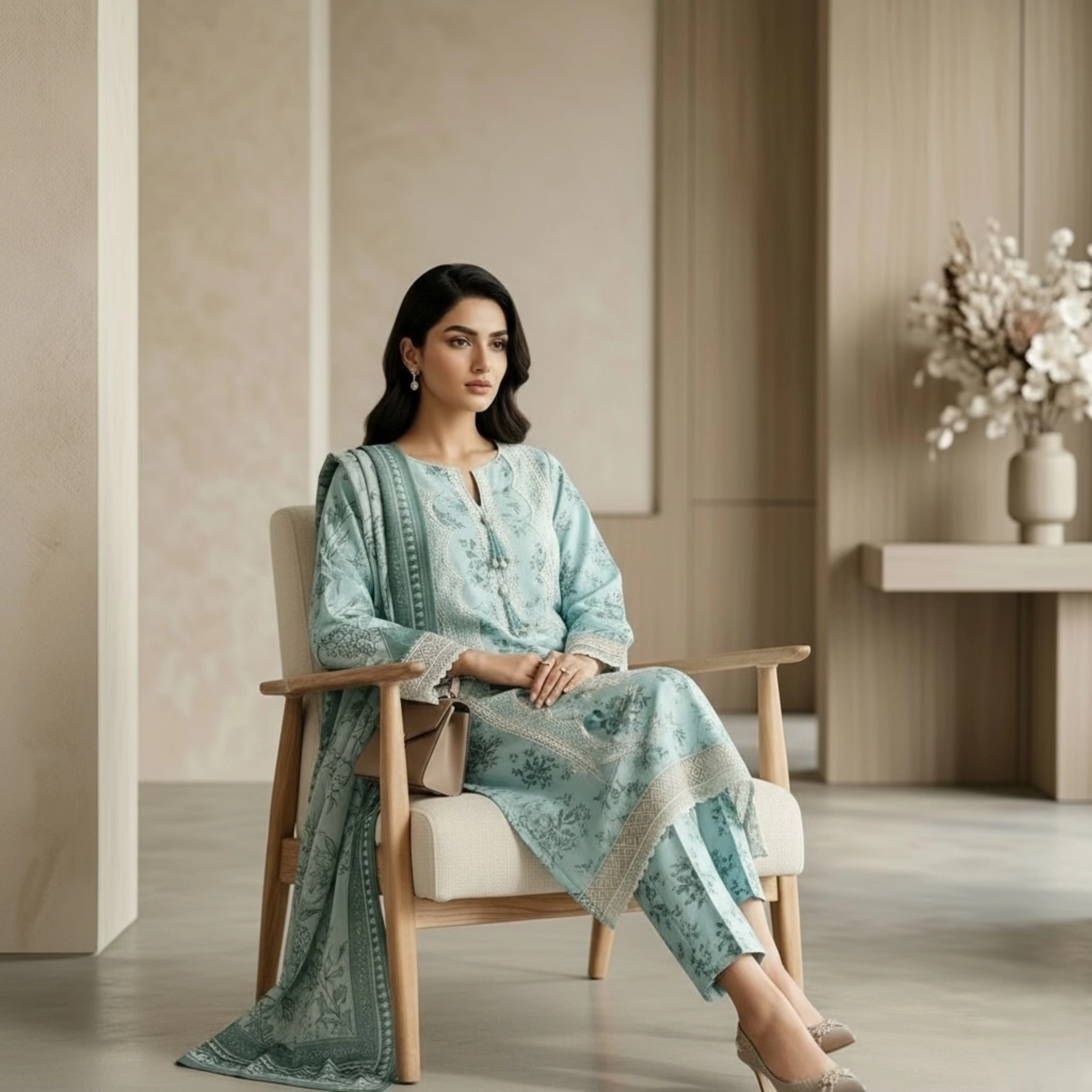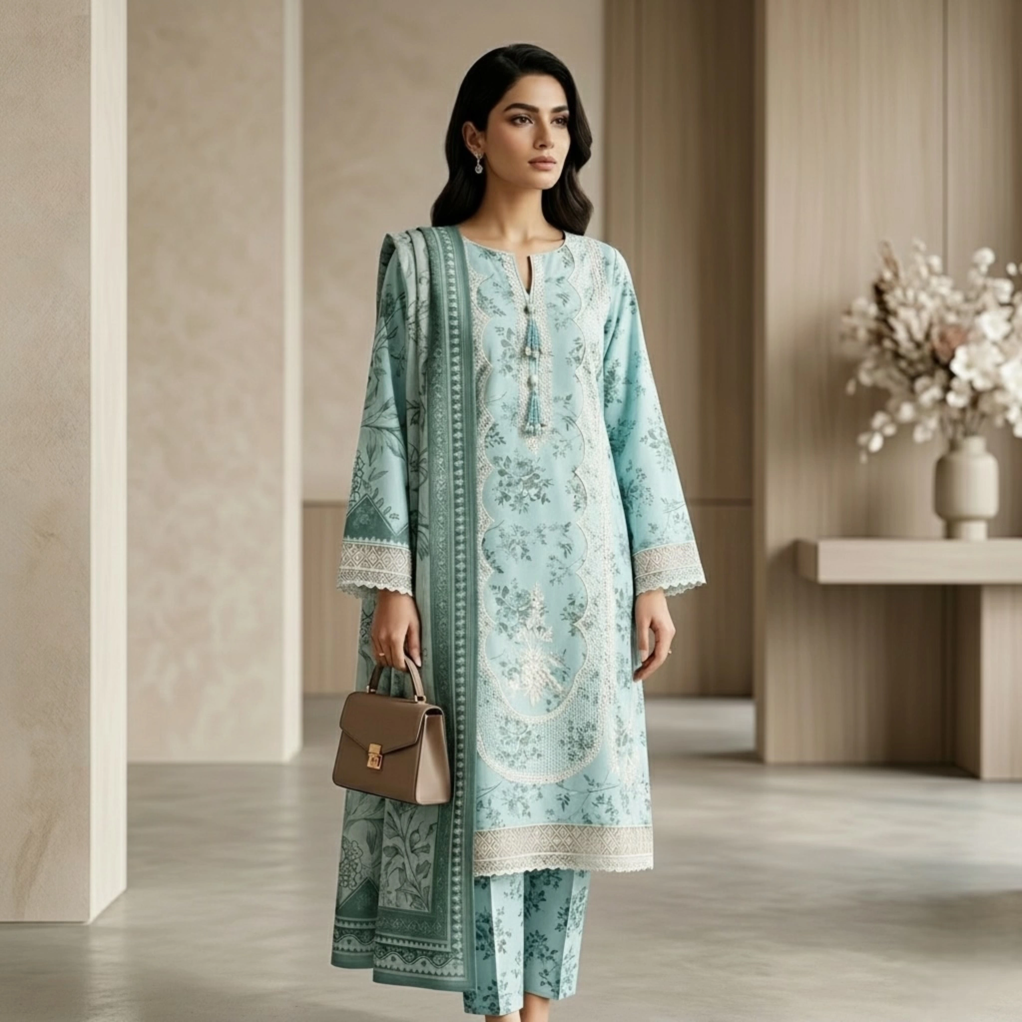 Shirt: Soft premium lawn with full embroidery (front & sleeves) and a custom border patch.