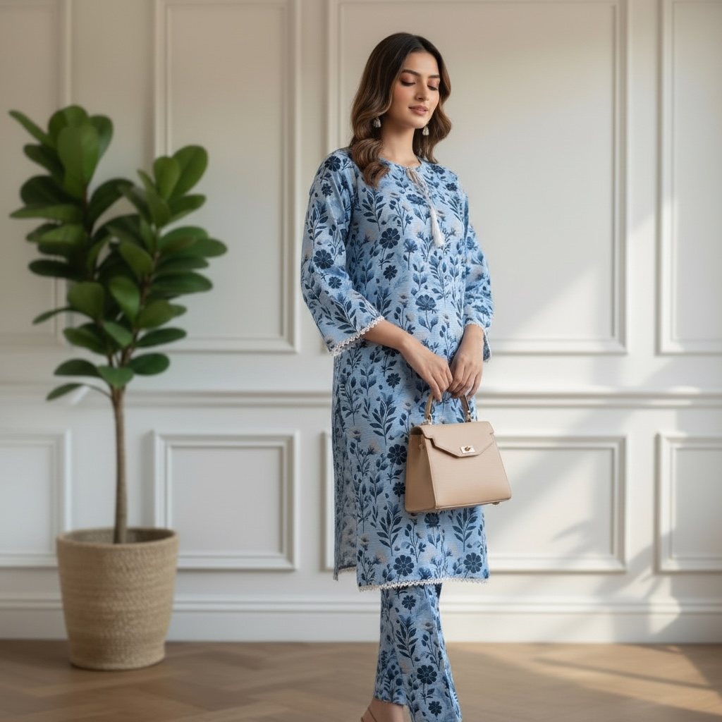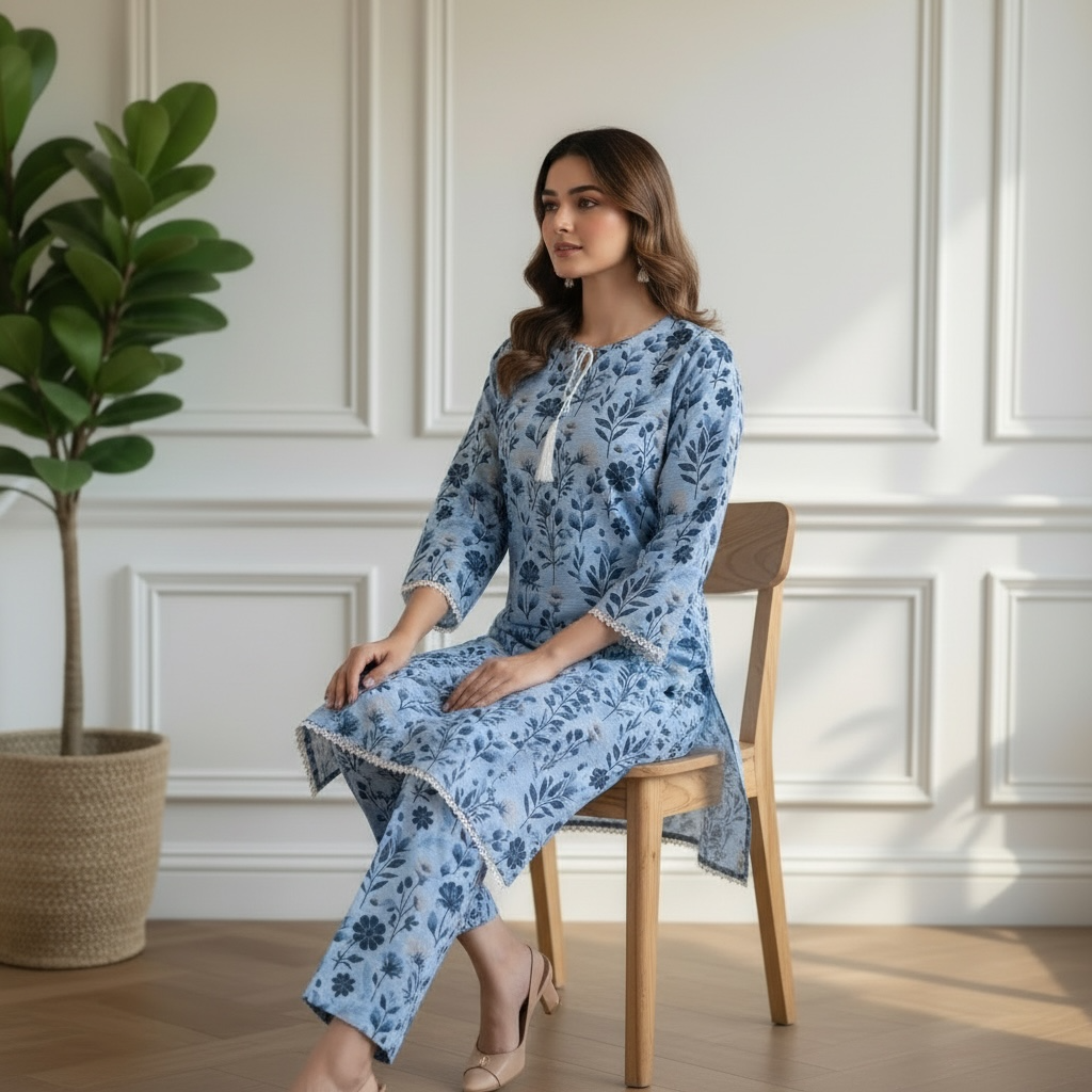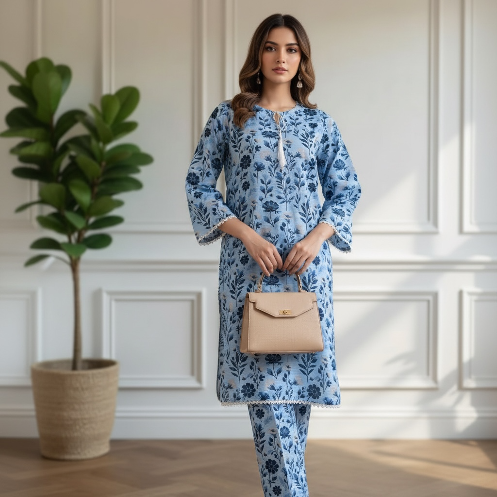 The suit features a refreshing ice blue base with a beautiful all-over dark blue floral print. It has elegant lace detailing on the sleeves and daman, along with a simple round neckline and a stylish tassel for a clean, modern look. It’s a perfect “everyday wear” choice for women who want comfort without compromising on style.