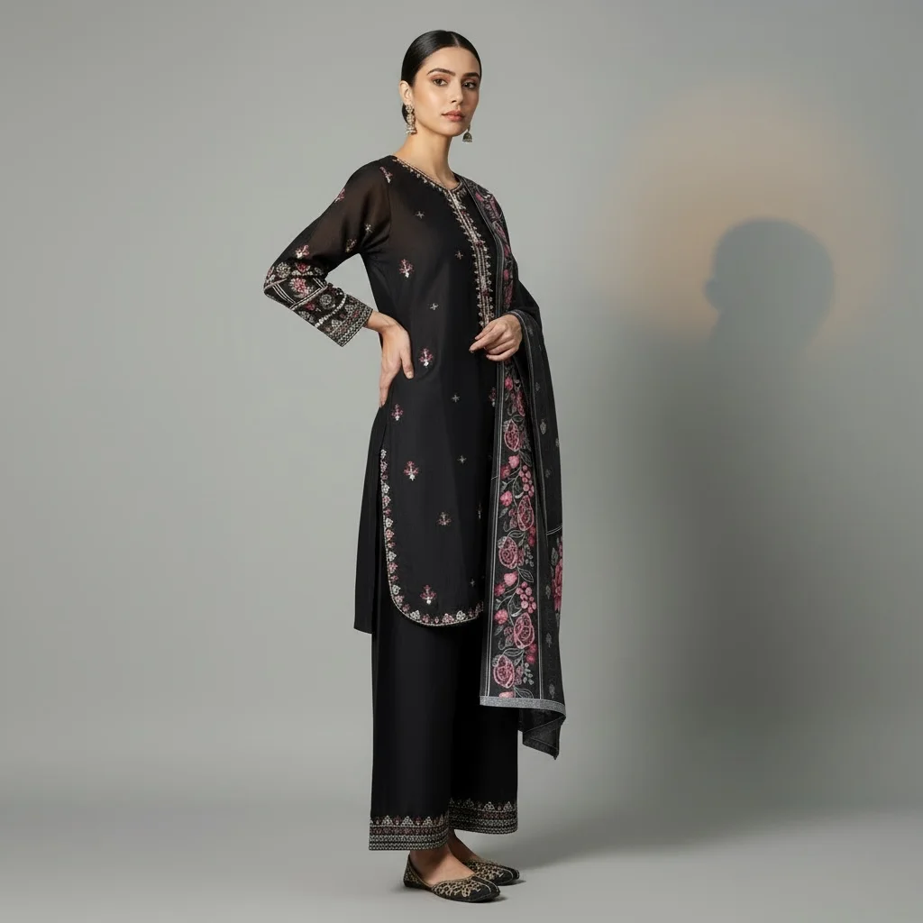 Premium Black Embroidered Ensemble – 3-Piece Summer Soft Cotton Stitched