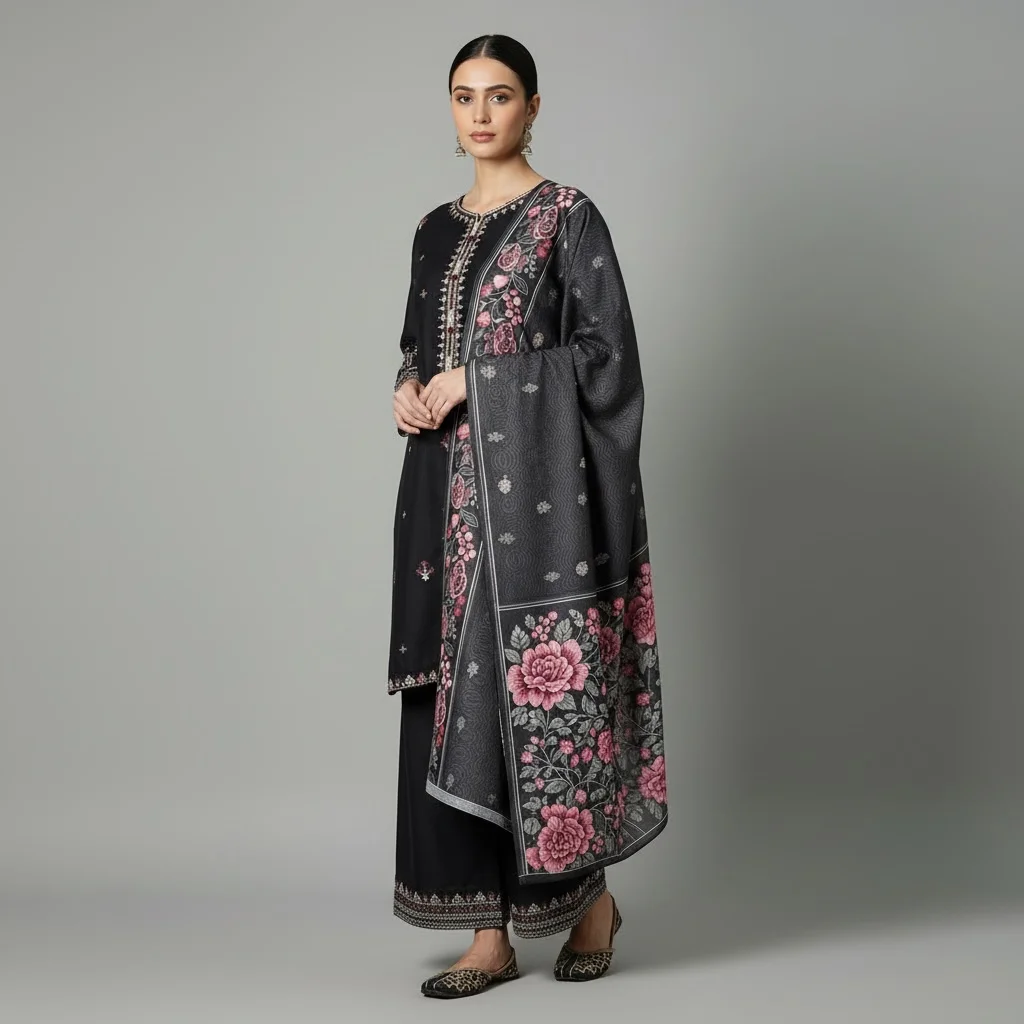 Dupatta: Lightweight, full-length printed dupatta featuring a rich floral vine pattern along the borders.